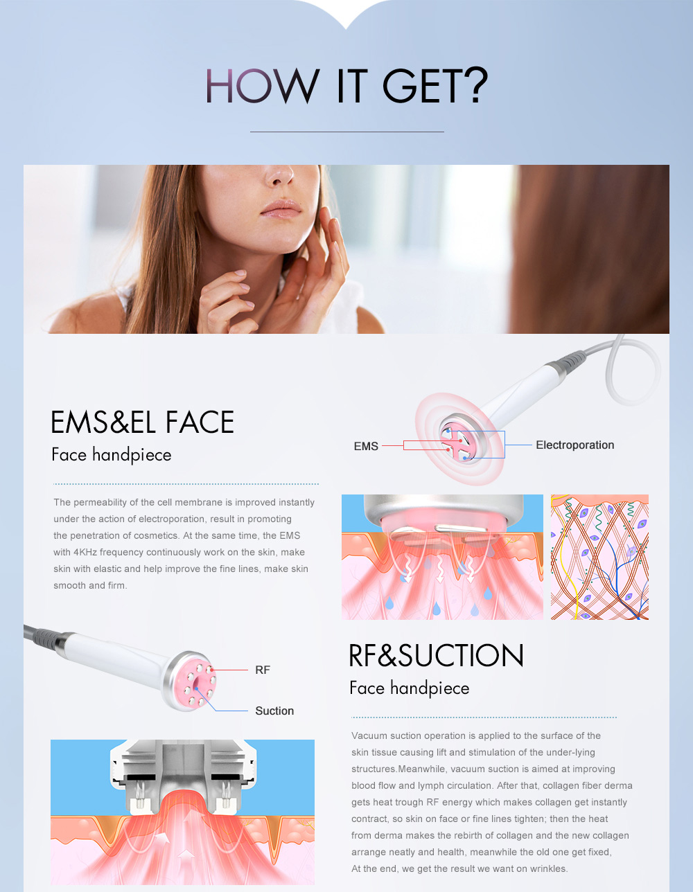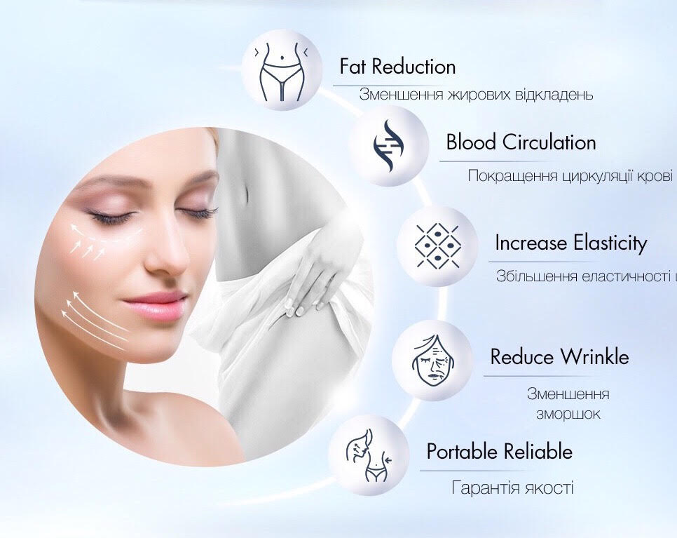 Антивіковий еффект для обличчя, через мікростимуляцію мязів, підтягує овал, зменшує зморшки та покращує колір обличчя.